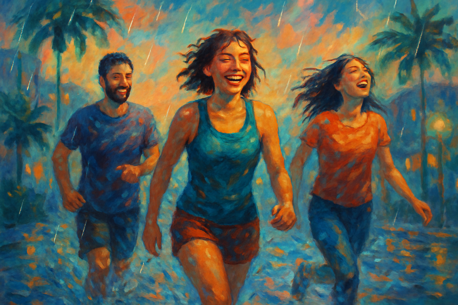 The first raindrops were tentative, almost polite. Then came the downpour. The real deal. Within moments, we were soaked to the skin—but free.
